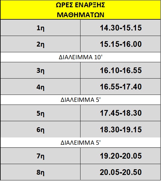 Τα μαθήματα κατάρτισης πραγματοποιούνται από Δευτέρα έως Παρασκευή τις μεσημεριανές και απογευματινές ώρες, σύμφωνα με το παρακάτω ωρολόγιο πρόγραμμα. Η διάρκεια της ωριαίας διδασκαλίας όλων των μαθημάτων καθορίζεται σε σαράντα πέντε (45) λεπτά. Ο μέγιστος αριθμός των ωρών διδασκαλίας καθορίζεται σε οκτώ (8) ώρες ανά ημέρα κατάρτισης. Η ώρα έναρξης είναι στις 15:15, ενώ υπάρχει πιθανότητα λόγω αναπληρώσεων να ξεκινούν κάποιες ημέρες την 1η ώρα. Επομένως, ανάλογα με το πρόγραμμα τα μαθήματα λήγουν το αργότερο 20:50.